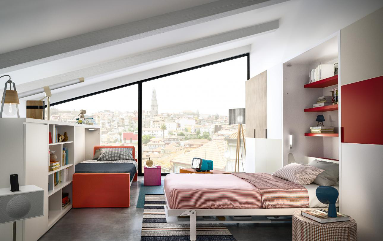 Letti a scomparsa che diventano pareti, librerie che sembrano uscire dall’armadio, divani che al pomeriggio non ci sono, di sera invece si: le soluzioni Young di Clei sono finalizzate ad ottimizzare lo spazio al millimetro, per garantire ai ragazzi la massima libertà di movimento.